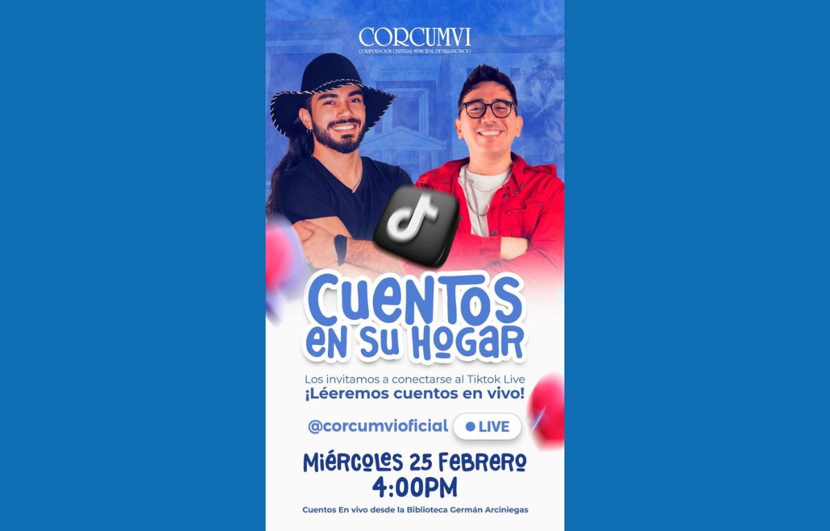 Usando la red social Tik Tok de la Corporación Cultural Municipal de Villavicencio Corcumvi: @corcumvioficial. Hoy, miércoles 25 de febrero, a partir de las 4: 00 p. m, los cuenteros Juan Camilo González Pardo, más conocido como ‘Mechas’ y Francisco Sánchez Liberado, leerán cuentos para todas las familias, a través de un En Vivo, mediante la iniciativa ‘Cuentos en su Hogar’.