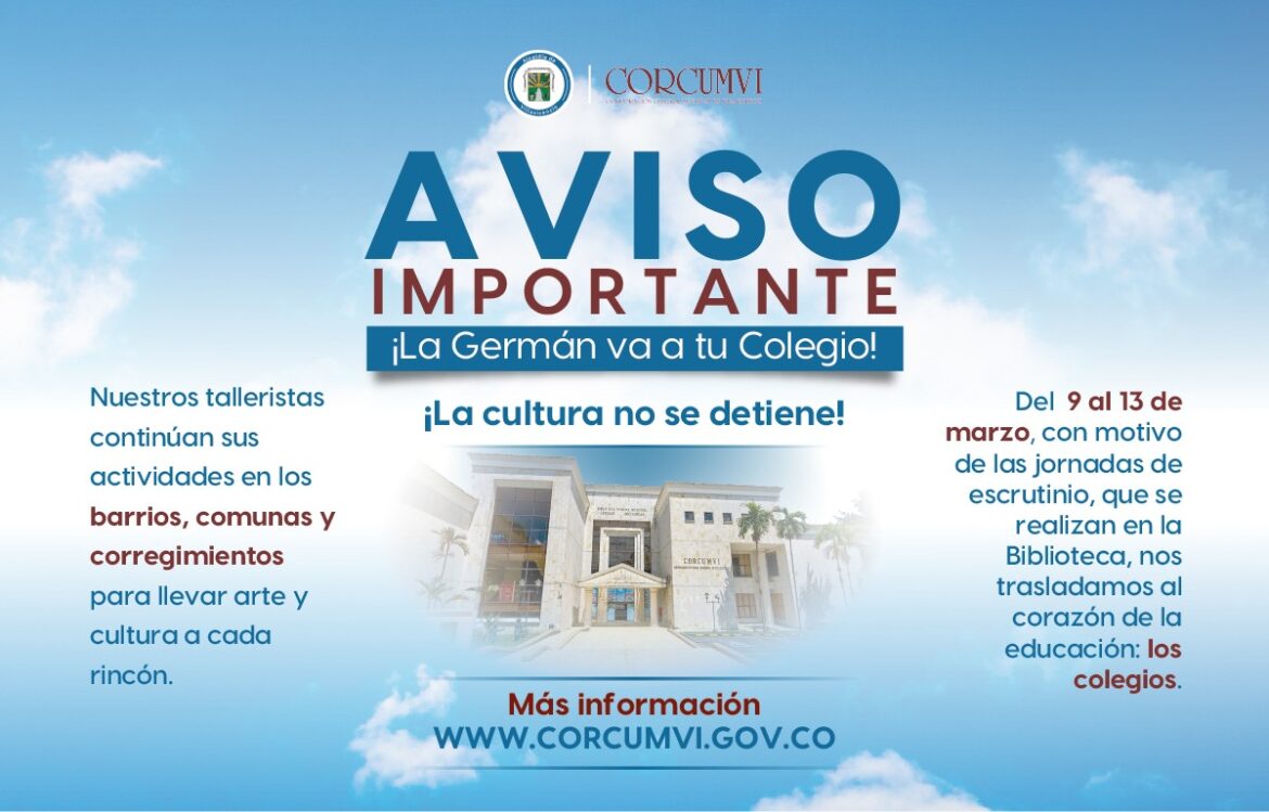 Desde hoy 9 hasta el 13 de marzo, los servicios de las salas de lectura ofrecidos en la biblioteca y los programas brindados en la Corporación Cultural Municipal de Villavicencio Corcumvi, serán llevados al territorio, gracias a la iniciativa ‘La Germán va a tu colegio’.